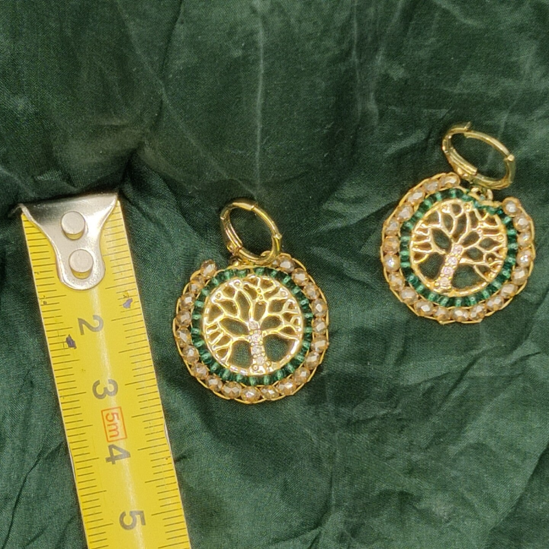 Neu gekaufte Baum-Ohrringe (echt vergoldet mit Zirkonia) wurden mit grünen Rocailles und roséfarbenen facettierten Perlen umnäht.